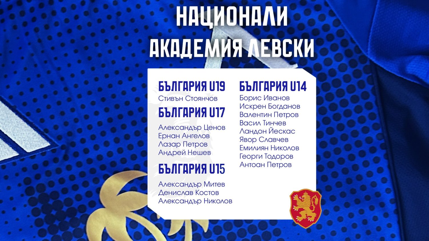 От Академия “Левски” изразяват своята гордост и пожелават на всички свои възпитаници успех с екипа на България! Тези повиквателни не са просто признание за индивидуалния талант на момчетата, но и за качествената и последователна работа на целия треньорски щаб и ръководство на школата. Бъдещето на българския футбол изглежда все по-светло, а “синята” следа в него – все по-дълбока!